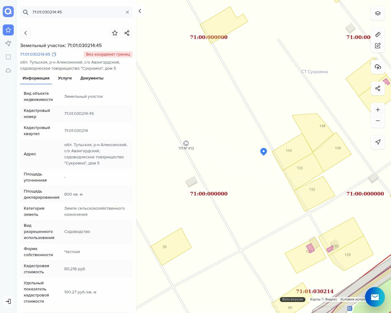 Земельный участок, площадь: 800 кв.м., категория земель: Земли сельскохозяйственного назначения, разрешенное использование: Садоводство, кадастровый номер: 71:01:030214:45