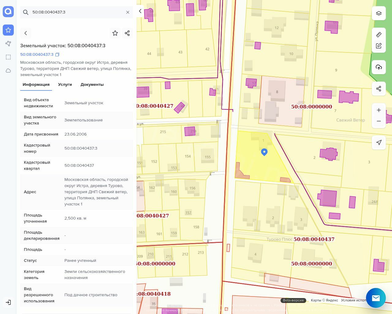 Земельный участок, кадастровый номер 50:08:0040437:3, виды разрешенного использования объекта - под дачное строительство, площадь 2500 кв. м.; Адрес: Московская область, Истринский муниципальный район, городское поселение Снегири, территория ДНП «Свежий ветер», участок № 1