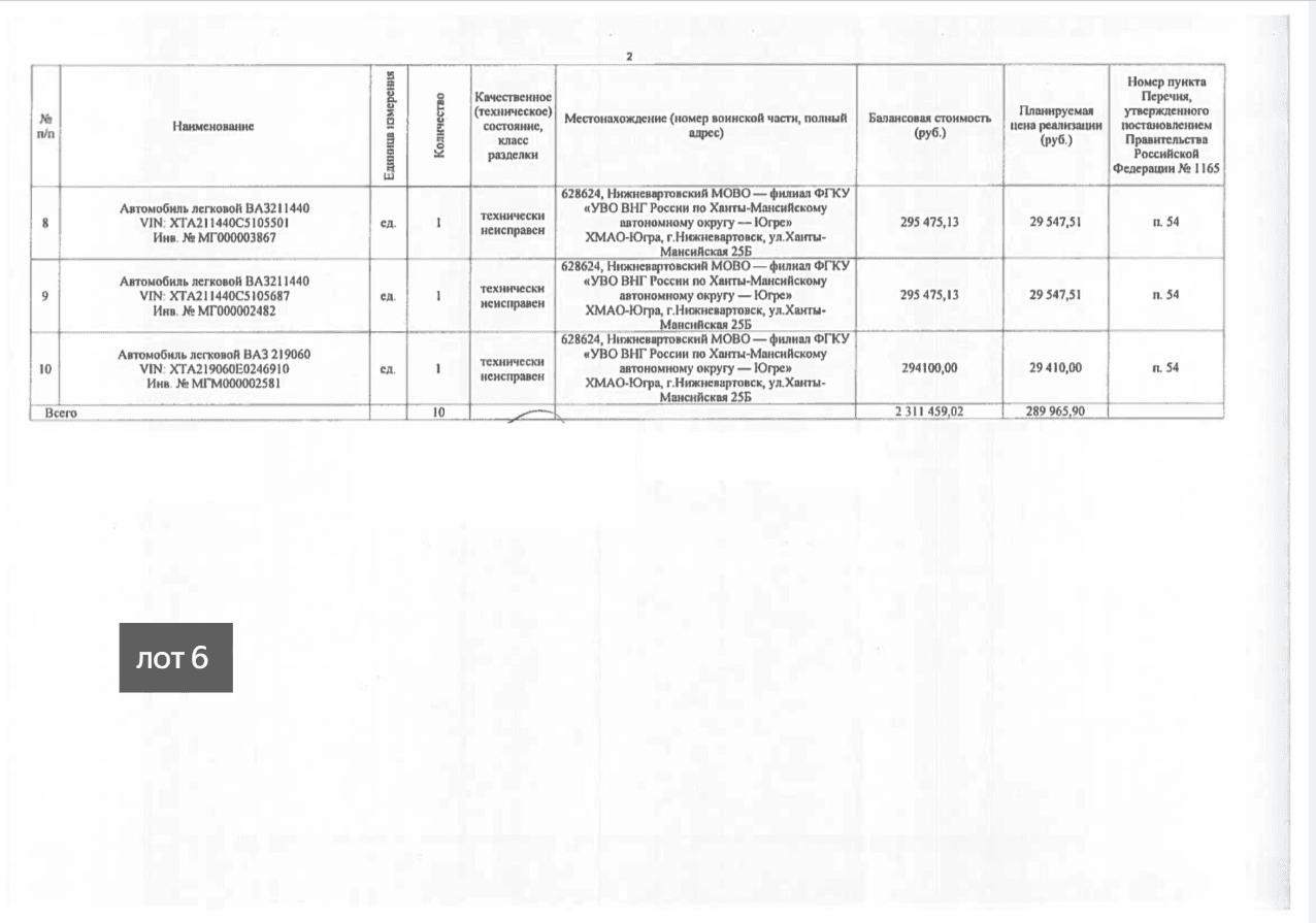 Местонахождение имущества: АО Ханты-Мансийский Автономный округ - Югра, г.о. Нижневартовск, г Нижневартовск, ул Северная, дом 96 Категория объекта: Легковые автомобили Форма собственности: Федеральная собственность