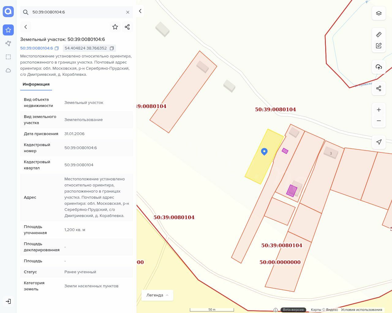 Земельный участок с кадастровым номером 50:39:0080104:6 площадью 1200 кв. м.