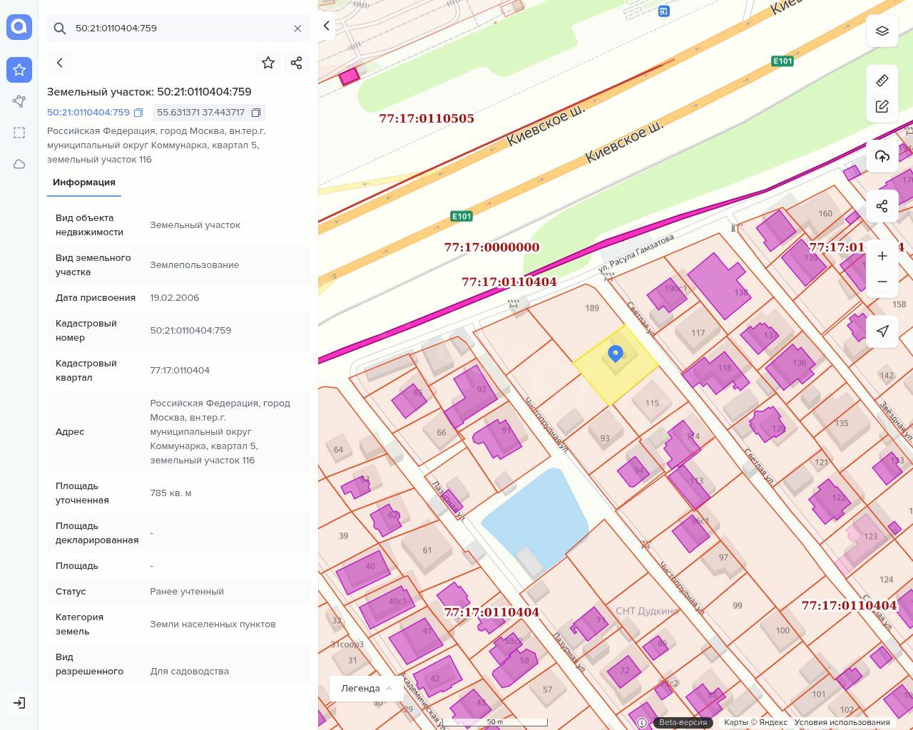 Земельный участок, с кадастровым номером 50:21:0110404:759, площадью 767 кв. м., разрешенное использование: для садоводства.