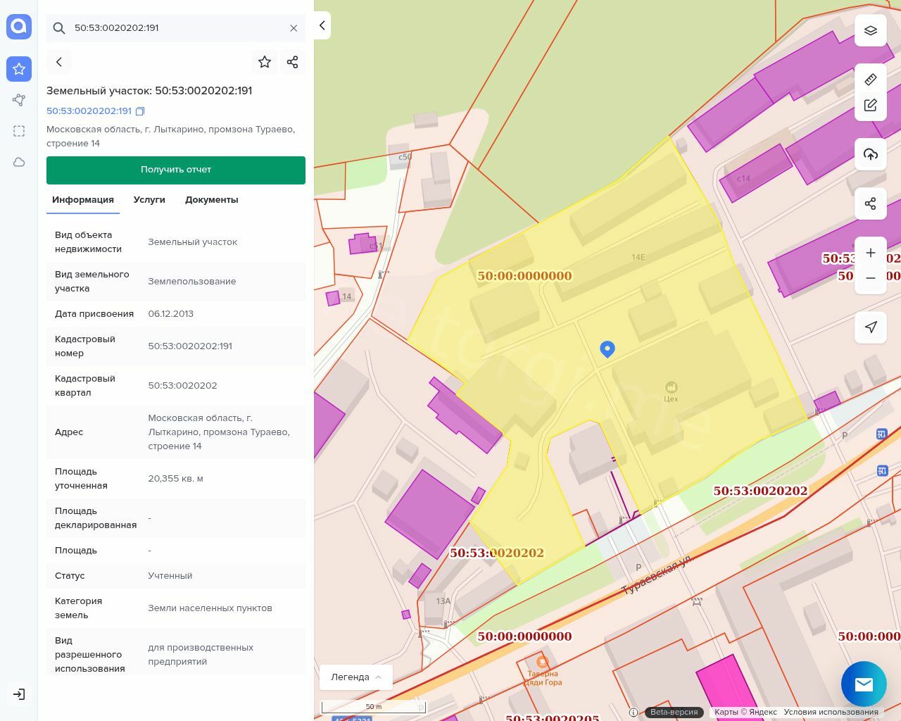 1) Земельный участок площадью 20 355,00 кв.м., кад. №50:53:0020202:191 Адрес: Московская область, г. Лыткарино, промзона Тураево, строение 14;