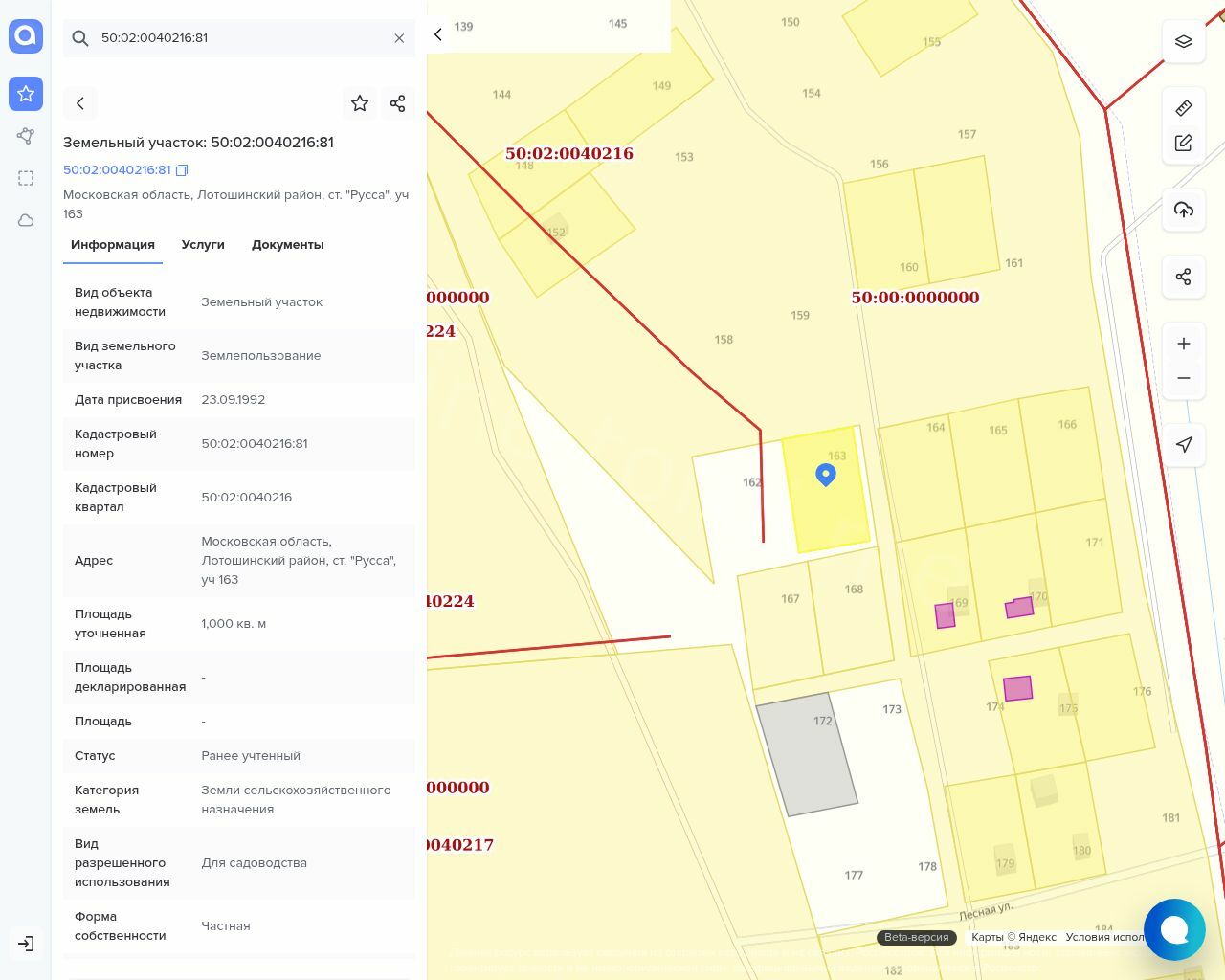 Земельный участок, площадью 1000 +/- 22 кв.м, кадастровый № 50:02:0040216:81, категория земель: земли сельскохозяйственного назначения, вид разрешенного использования: для садоводства.