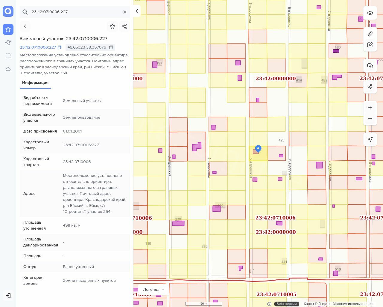 Земельный участок, площадь: 498 кв.м., категория земель: Земли населенных пунктов, разрешенное использование: для садоводства, кадастровый номер: 23:42:0710006:227