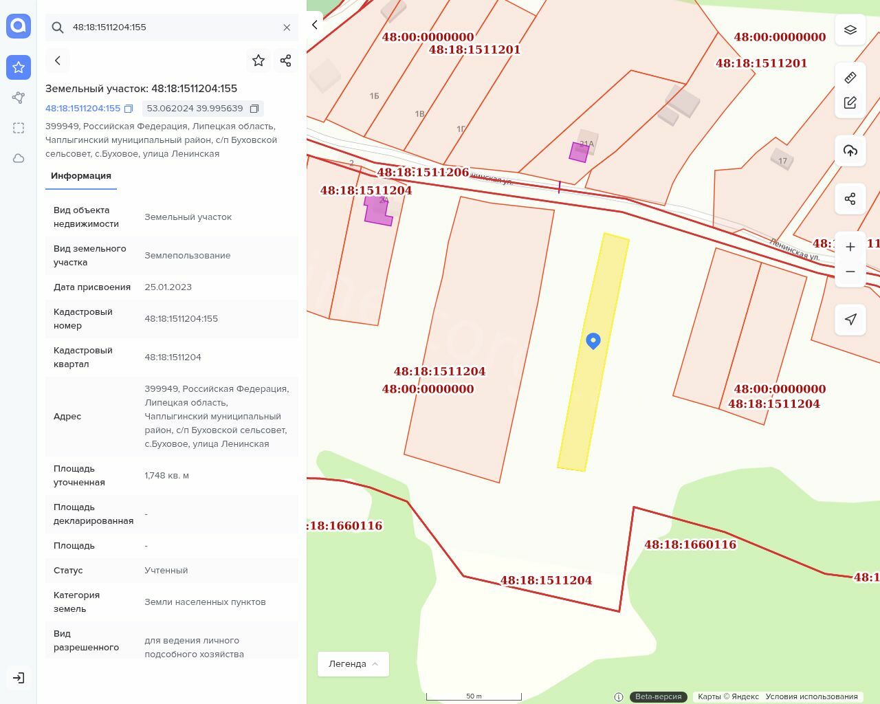 Земельный участок, категория земель: земли населенных пунктов, вид разрешенного использования: для ведения личного подсобного хозяйства, общая площадь 1748 кв.м, кадастровый номер 48:18:1511204:155.