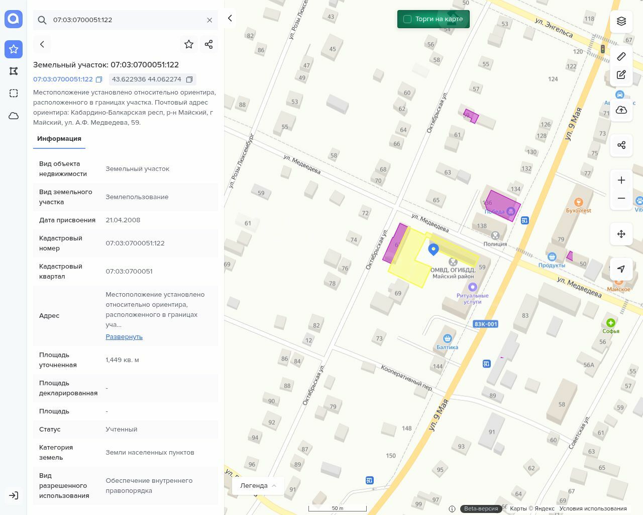 Земельный участок с кадастровым номером 07:03:0700051:122, площадью 1449 кв.м., с расположенными на нем объектами недвижимости с кадастровыми номерами 07:03:0700000:8245, площадью 199,6 кв.м., 07:03:0700000:8360, площадью 91,2 кв.м., расположенные по адресу: Кабардино-Балкарская респ, р-н Майский, г. Майский, ул. А.Ф. Медведева, 59