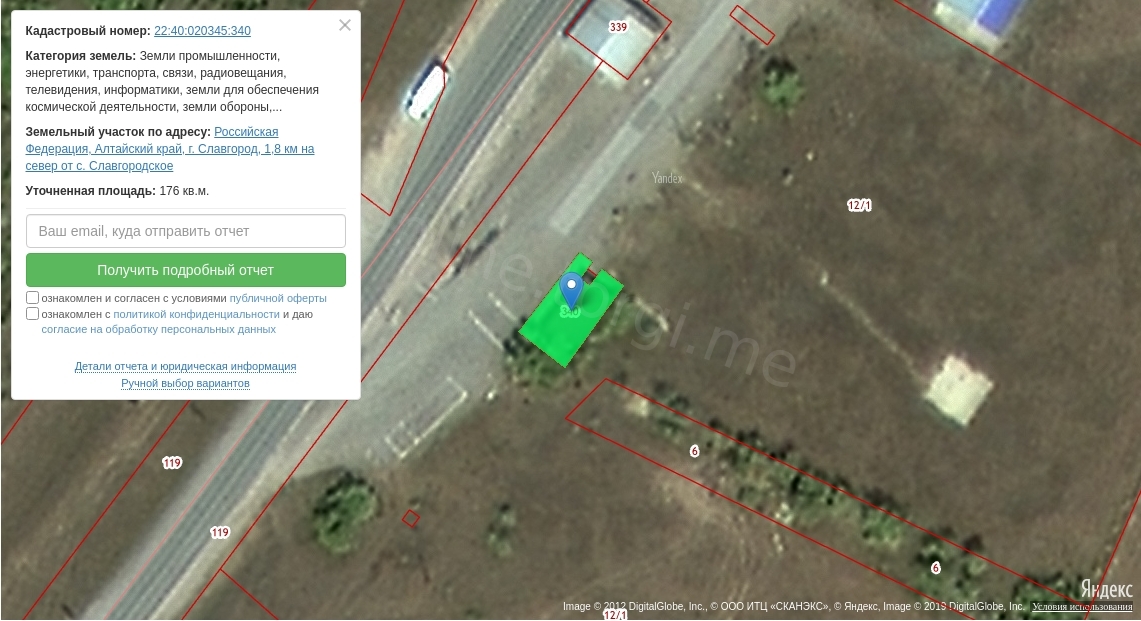 Земельный участок площадью 176 кв.м. кадастровый номер № 22:40:020345:340 с расположенным на нем зданием назначение нежилое, общая площадь 63,2 кв.м., этажность 1, кадастровый № 22:40:020328:162, расположенные по адресам: Алтайский край, г. Славгород, 1,8 км на север от с. Славгородское и в 2 км севернее с. Славгородское