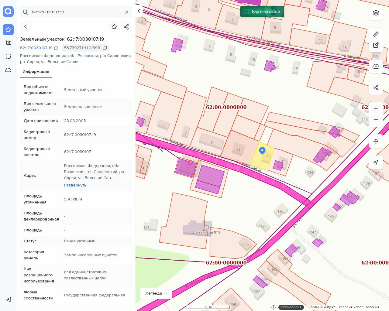 Здание с кадастровым номером 62:17:0030107:423, площадью 57,1 кв.м (Год ввода в эксплуатацию: 1969 ), РНФИ: П12710012071, земельный участок с кадастровым номером 62:17:0030107:19, РНФИ: П11710005155, площадью 550,0 кв. м, расположенные по адресу: Рязанская область, Сараевский район, р.п. Сараи, ул. Почтовая, д. 13