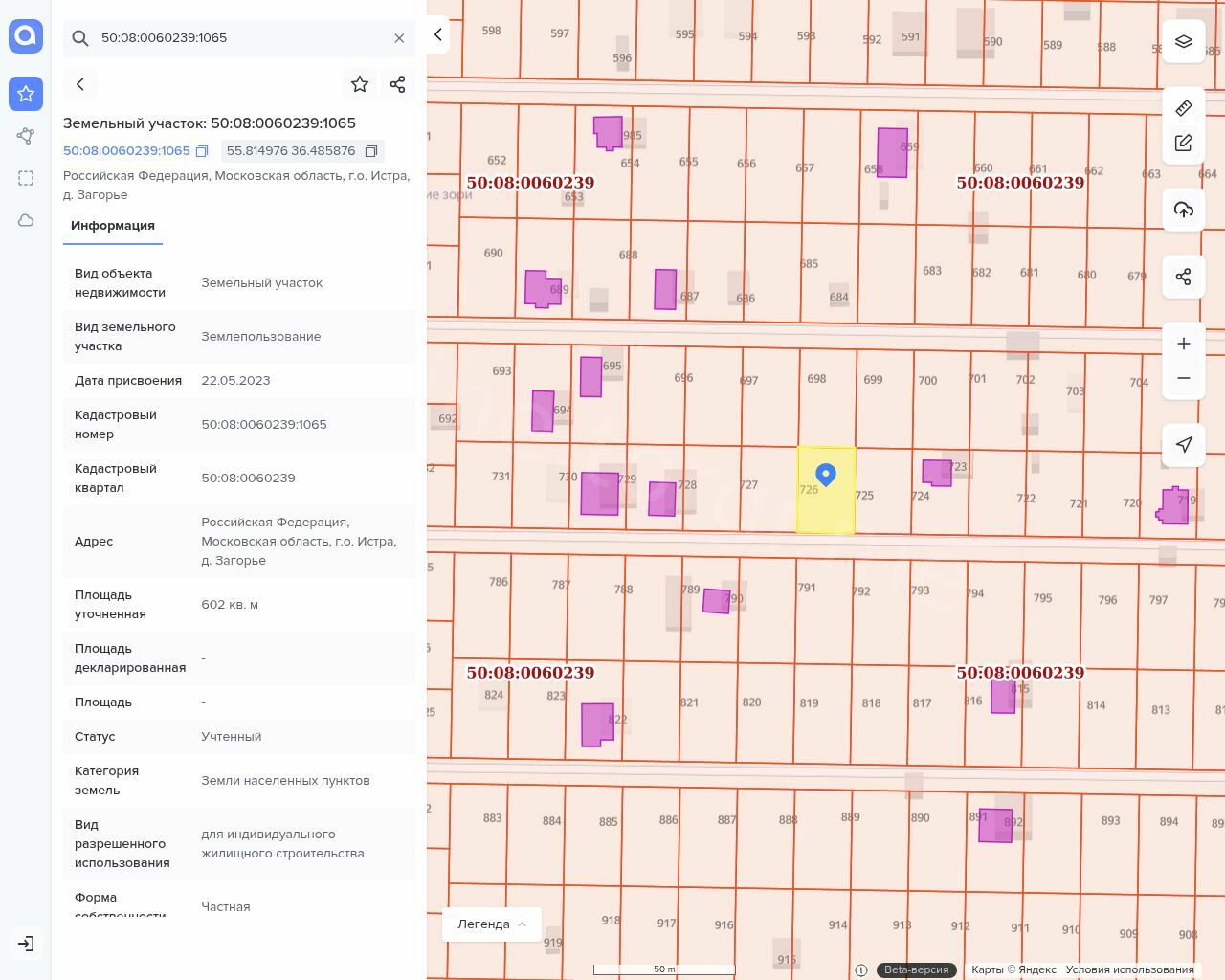 Земельный участок, площадь 602 +/- 9 м2, кадастровый номер 50:08:0060239:1065