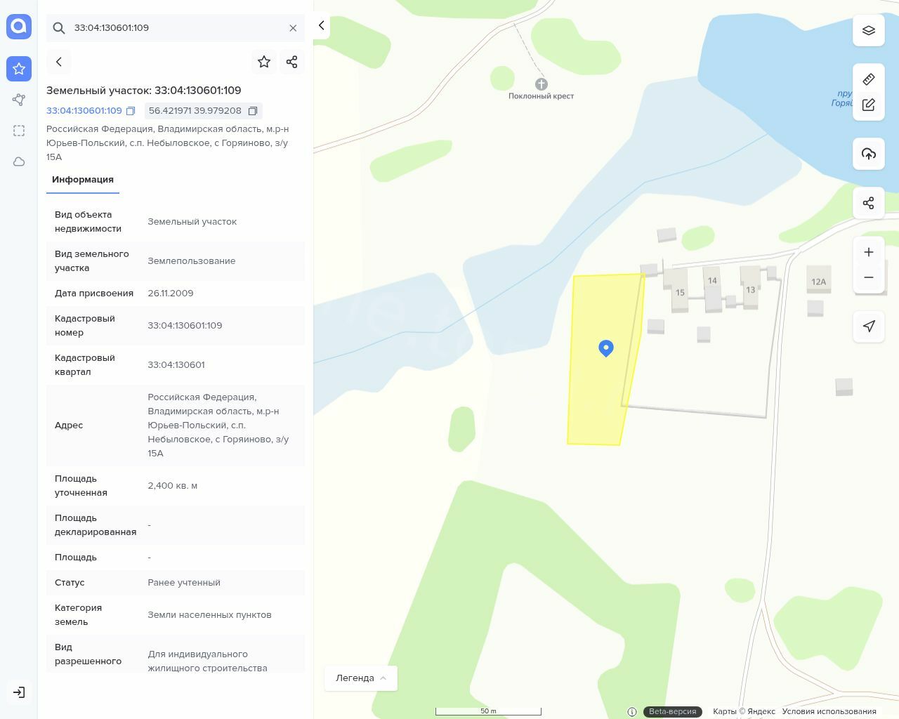 Земельный участок, кадастровый (условный) номер 33:04:130601:109, площадь 2400+-17 м2. Обременения и судебные споры отсутствуют