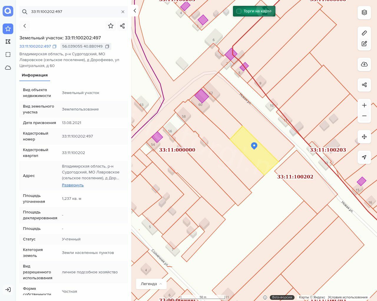 Земельный участок. Категория земель: Земли населенных пунктов Вид разрешенного использования: личное подсобное хозяйство. Площадь: 1237 кв.м. Кадастровый номер: 33:11:100202:497 Вид права: собственность.
