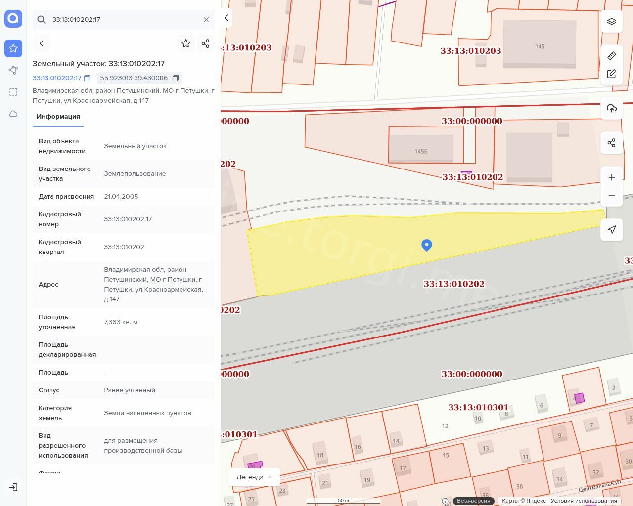 Земельный участок, категория земель: земли населенных пунктов, вид разрешенного использования: для размещения производственной базы, площадью 7400+/- 60 кв.м., кадастровый (условный) номер 33:13:010202:17; Адрес: Владимирская обл., р-н Петушинский, МО г. Петушки, ул. Красноармейская, дом 147.