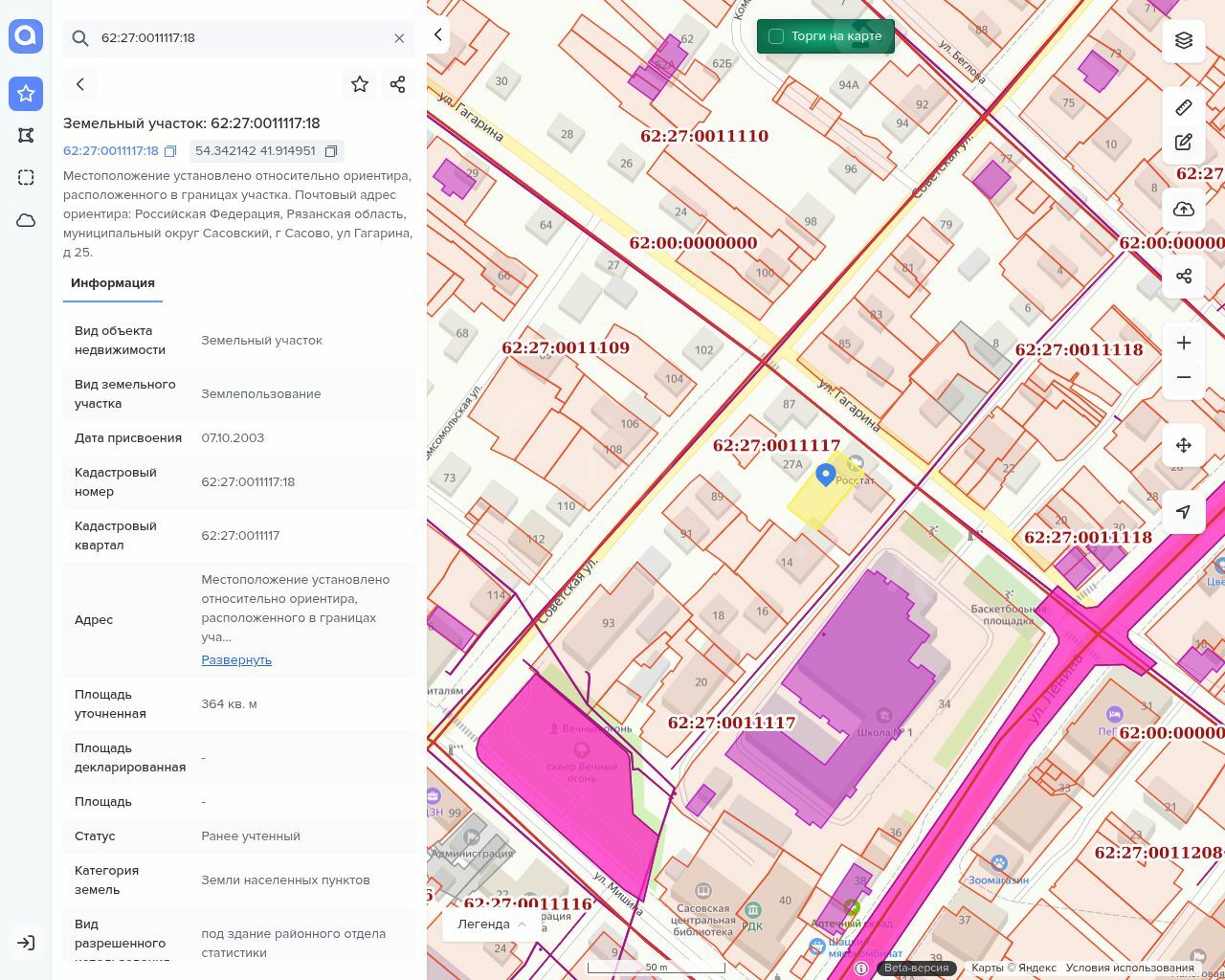 земельный участкок, площадью 364 кв. м, с кадастровым номером 62:27:0011117:18, РНФИ: П11620000652, с расположенными на нем объектами недвижимого имущества — здания площадью 157,3 кв. м, с кадастровым номером 62:27:0011117:39, РНФИ: П12620004057 и здания (гараж) площадью 20,5 кв. м, с кадастровым номером 62:27:0011117:40, РНФИ: П12620004056, а также объектов движимого имущества (счетчик электрический 3-х фазный, РНФИ: П25620000116, счетчик газовый, РНФИ: П25620000116, котел АОГВ, 23,2 EUROSIT, РНФИ: П25620000116, расположенные по адресу: Рязанская обл., г. Сасово, ул. Гагарина, 25