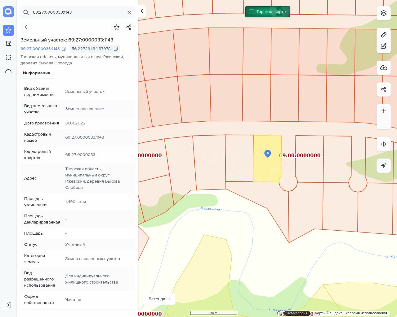 Лот №1 – Земельный участок, кадастровый номер: 69:27:0000033:1143, площадь 1490 кв.м, категория земель земли населенных пунктов, вид разрешенного использования: для индивидуального жилищного строительства. Титульный владелец супруг Кузин А. А., совместно нажитое имущество
