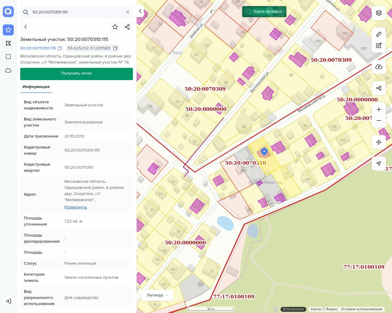 Земельный участок , площадь: 722кв.м., кадастровый номер: 50:20:0070310:115