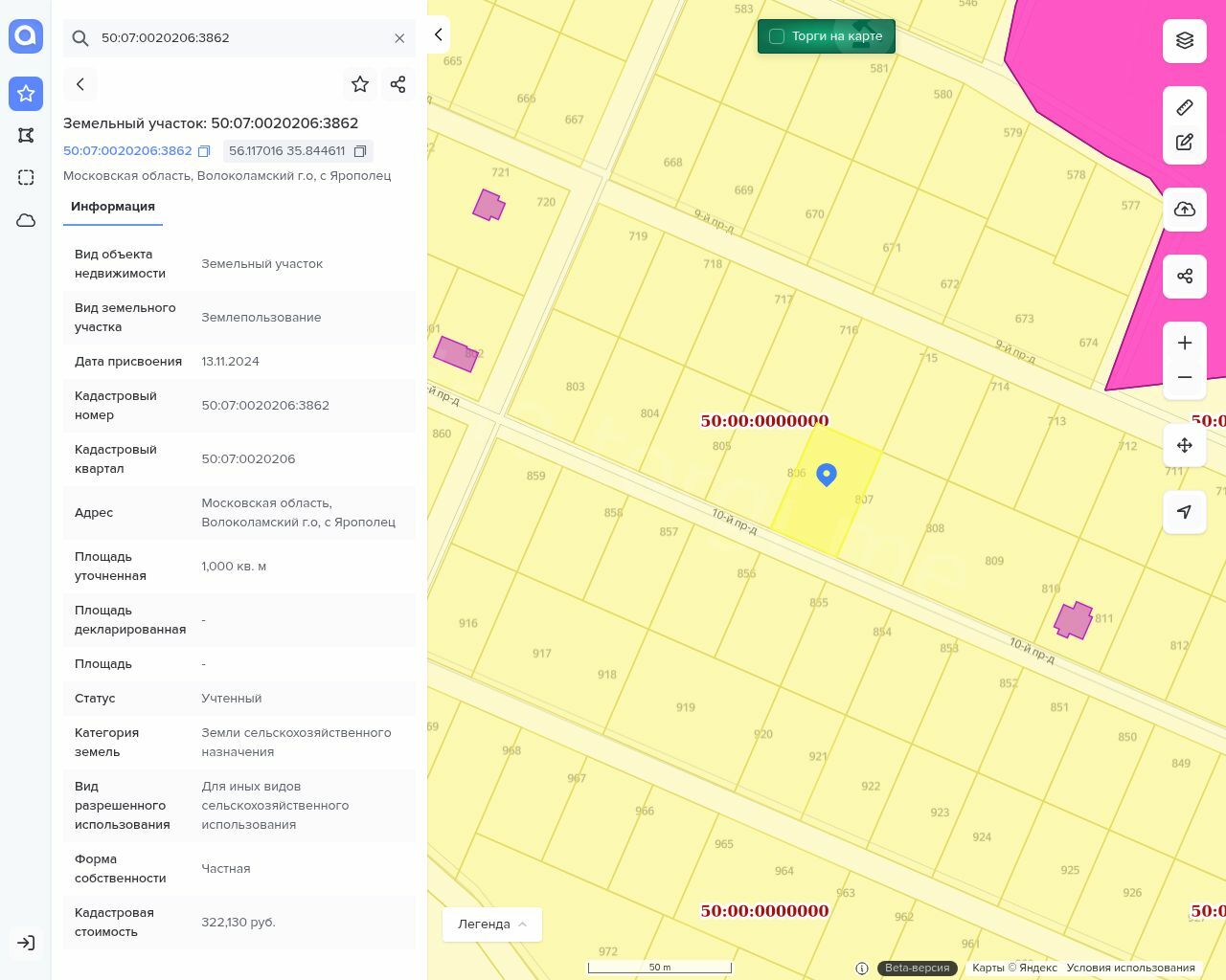 Вид объекта недвижимости: Земельный участок. Кадастровый номер: 50:07:0020206:3862. Назначение объекта недвижимости: данные отсутствуют. Виды разрешенного использования объекта недвижимости: Для иных видов сельскохозяйственного использования Площадь: 1000 +/- 11 м.кв.