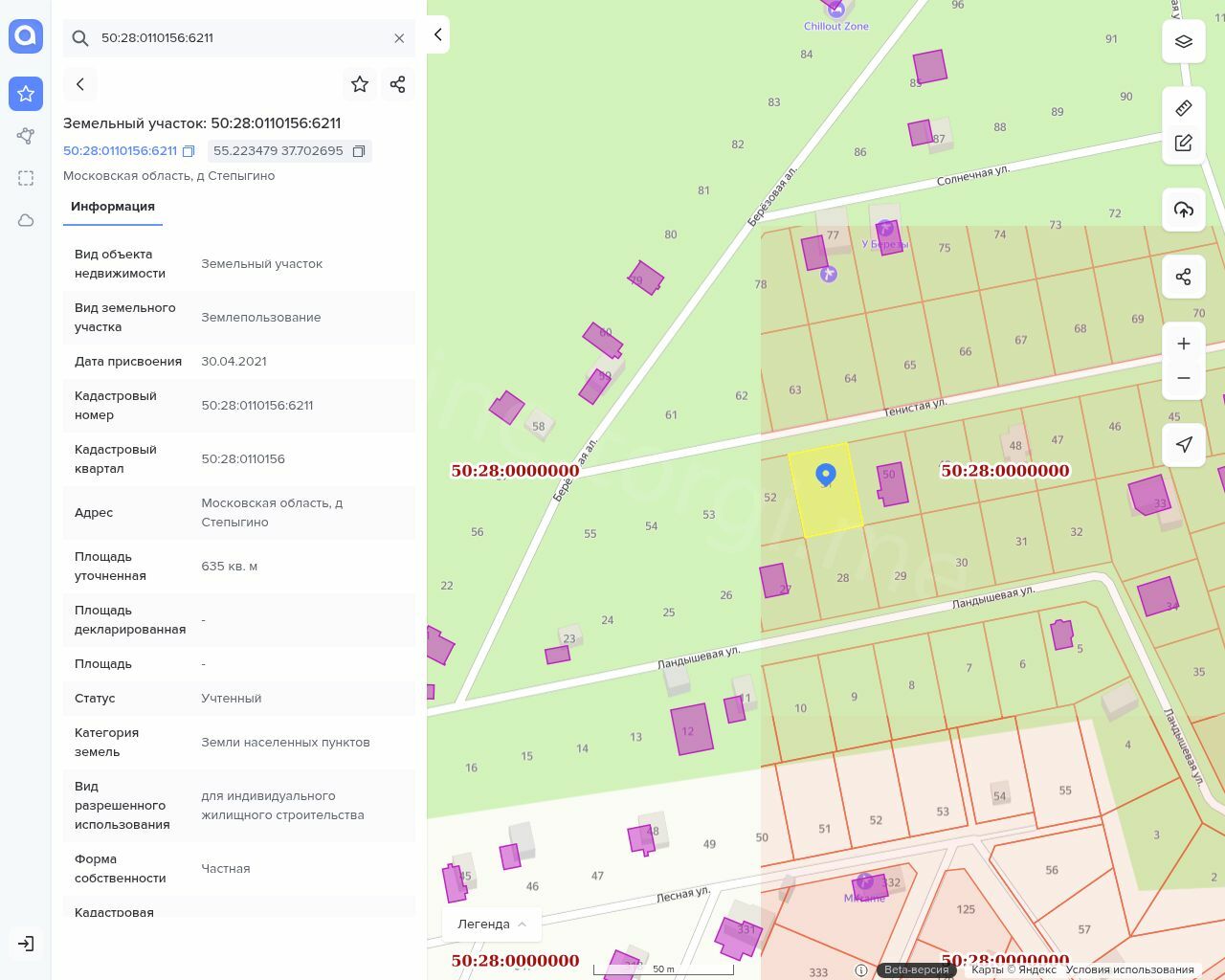 Земельный участок, разрешенное использование: для индивидуального жилищного строительства, категория земель: земли населенных пунктов, площадь: 635 кв.м., кадастровый номе: 50:28:0110156:6211