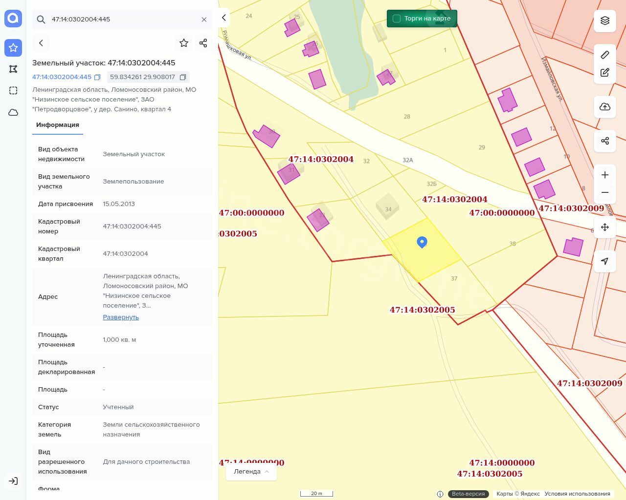 Лот №1 Земельный участок, кадастровый номер: 47:14:0302004:445, Виды разрешенного использования объекта недвижимости: для дачного строительства, площадь: 1000 +/- 22 кв.м., вид права, доля в праве: собственность.