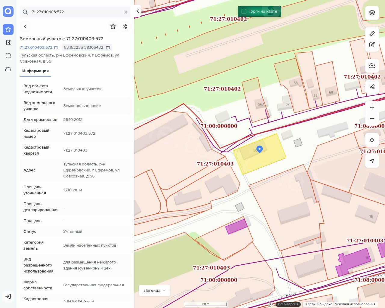 Адрес: обл Тульская, м.о. Ефремовский, г Ефремов, ул Совхозная, дом 56 Категория объекта: Имущественные комплексы Форма собственности: Федеральная собственность