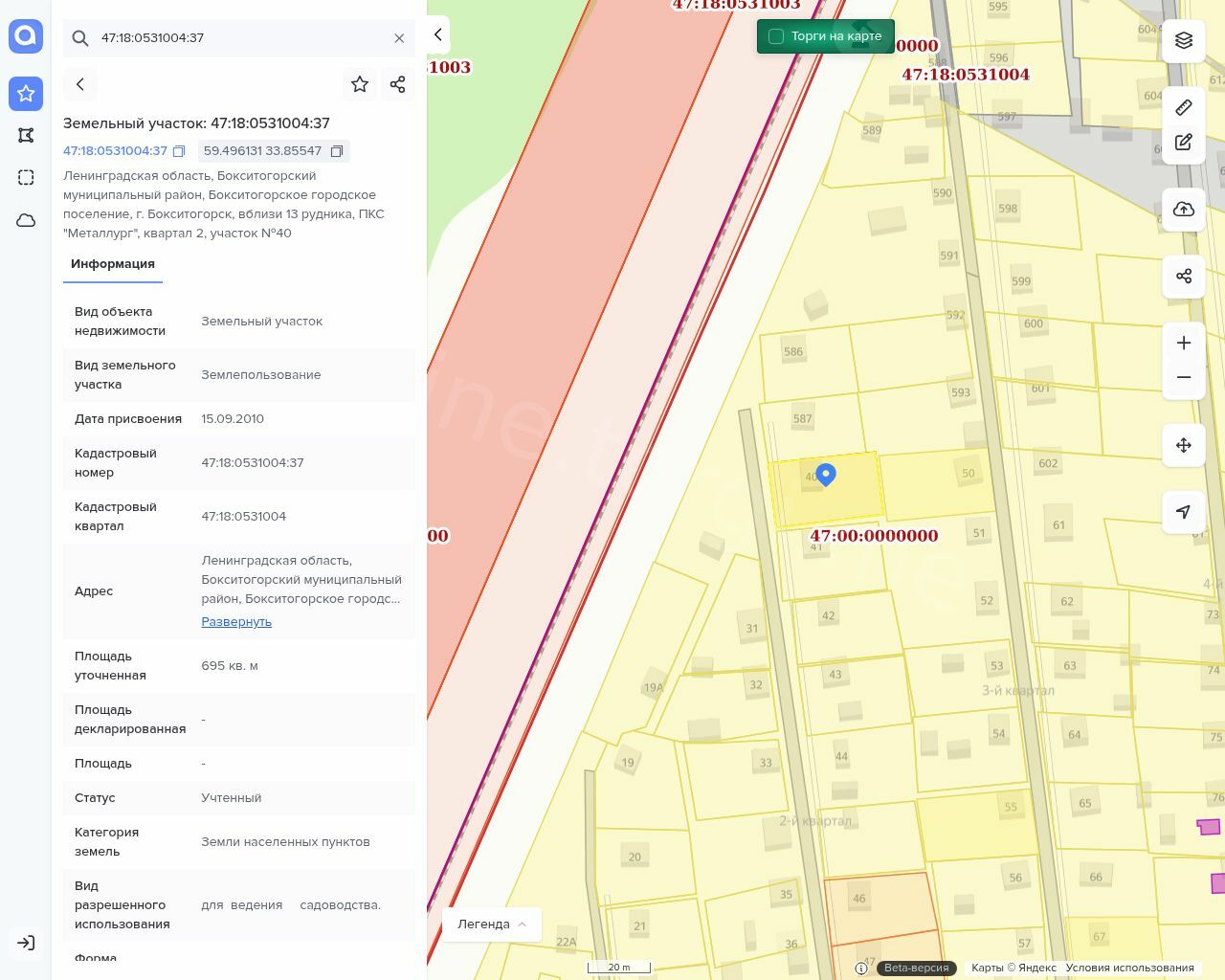 Адрес: Ленинградская область, Бокситогорский муниципальный район, Бокситогорское городское поселение, г. Бокситогорск, вблизи 13 рудника, ПКС Металлург, квартал 2, участок №40