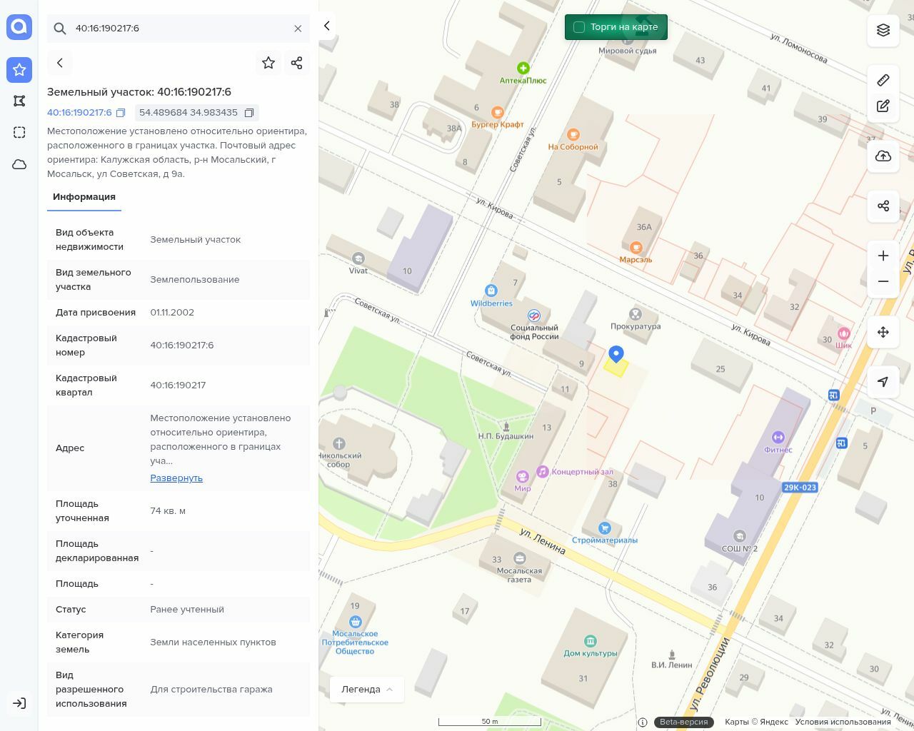 Продажа по минимально допустимой цене земельного участка площадью 74 кв.м, с кадастровым номером 40:16:190217:6 с расположенным на нем объектом недвижимого имущества — одноэтажное железобетонное, обложенное кирпичом, здание гаражей (два бокса) с кадастровым номером 40:16:190106:42, по адресу: Местоположение установлено относительно ориентира, расположенного в границах участка. Почтовый адрес ориентира: Калужская область, р-н Мосальский, г. Мосальск, ул. Советская, д. 9а