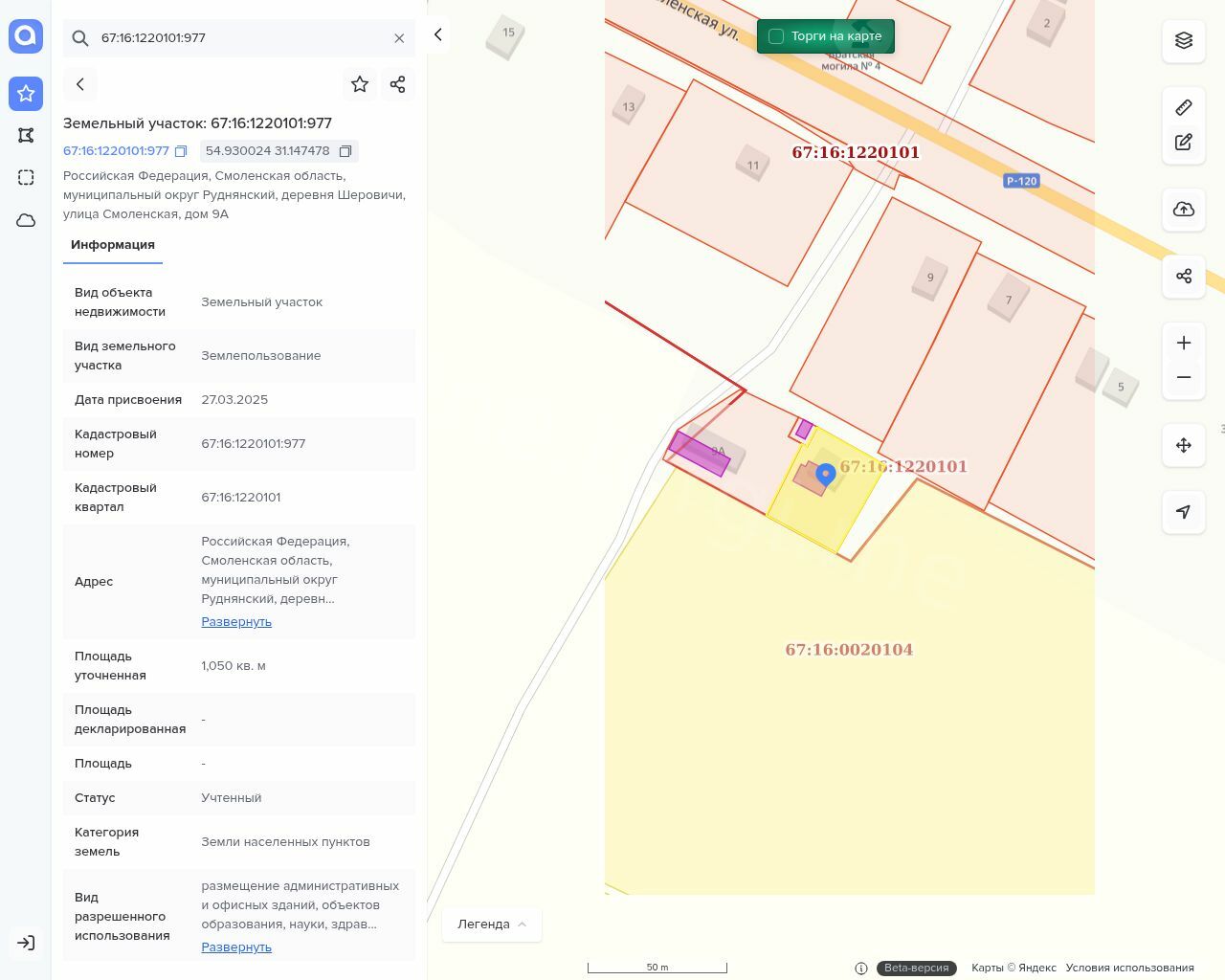 Продажа по минимально допустимой цене земельного участка площадью 1050 кв.м, с кадастровым номером 67:16:1220101:977, с расположенным на нем объектом недвижимого имущества - лаборатория с кадастровым номером 67:16:1220101:456, по адресу: Смоленская область, муниципальный округ Руднянский, деревня Шеровичи, улица Смоленская, дом 9А