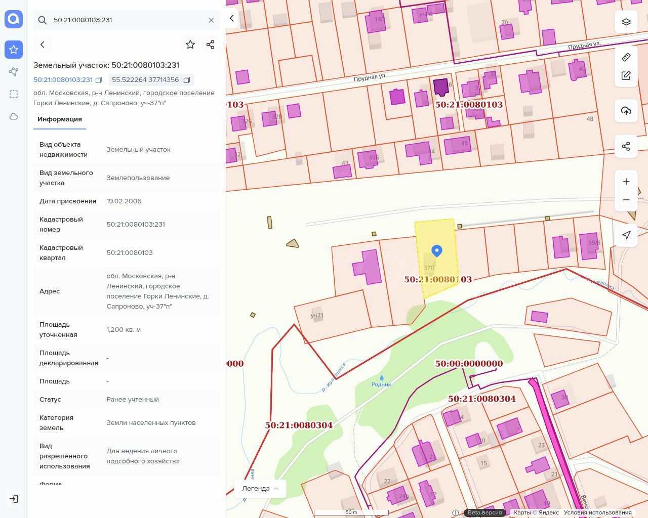 Земельный участок, кадастровый номер 50:21:0080103:231, площадь 1200 кв. м.