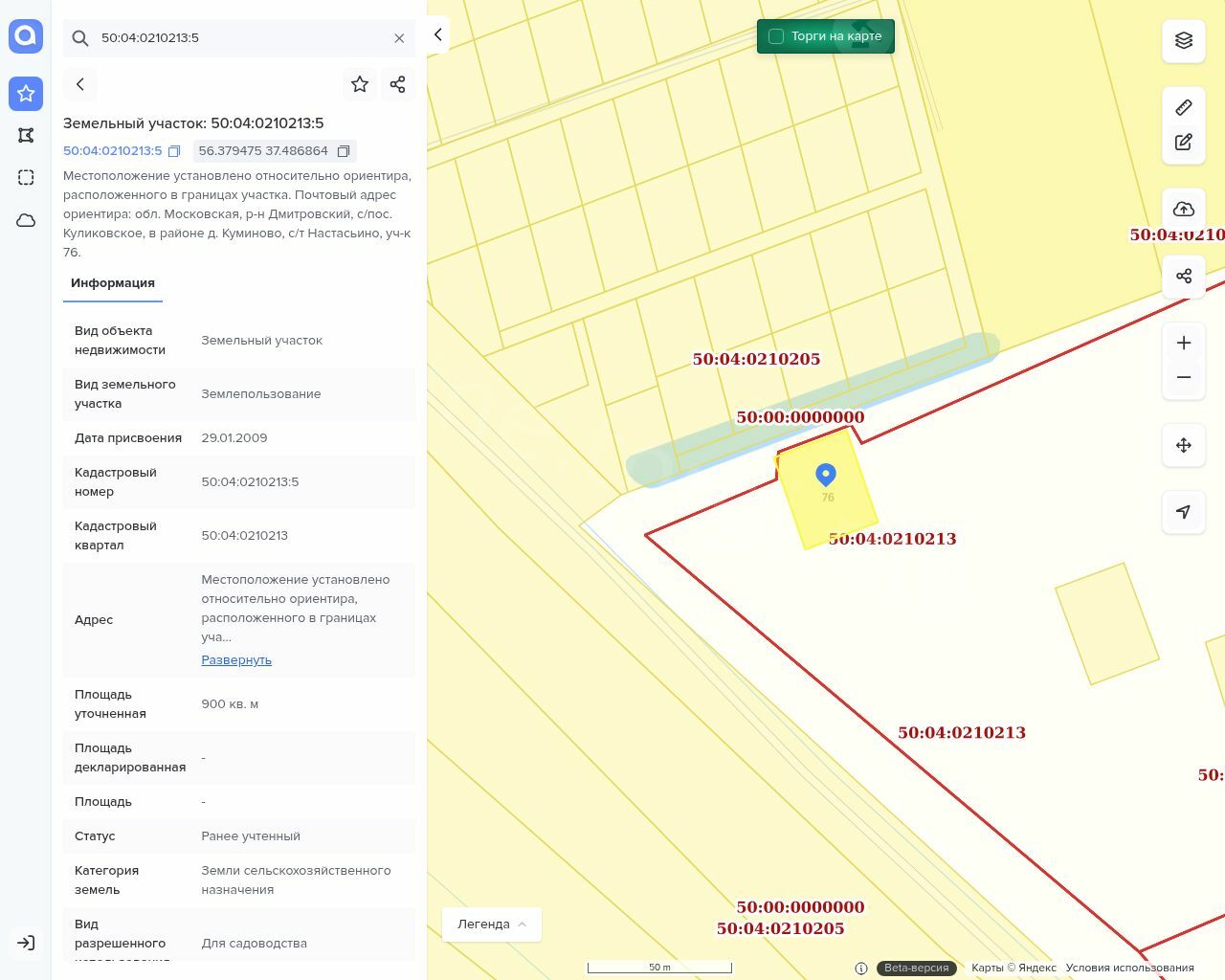 Земельный участок Кадастровый номер: 50:04:0210213:5 Категория: земли сельскохозяйственного назначения Назначение: для садоводства Площадь: 900 кв.м. Вид права, доля в праве: собственность