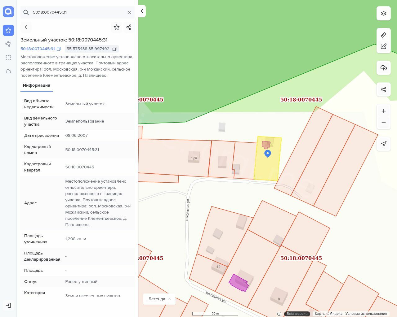 Земельный участок, кад. № 50:18:0070445:31 Для ведения личного подсобного хозяйства площадь 1208 кв.м. Адрес: Местоположение установлено относительно ориентира, расположенного в границах участка. Почтовый адрес ориентира: обл. Московская, р-н Можайский, сельское поселение Клементьевское, д. Павлищево