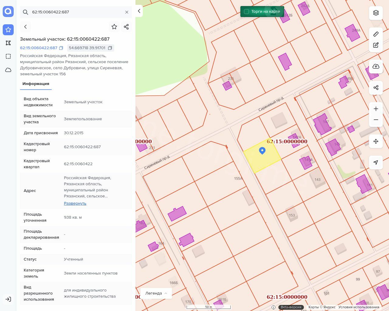 Земельный участок, кадастровый номер 62:15:0060422:687, площадь 938 кв.м.